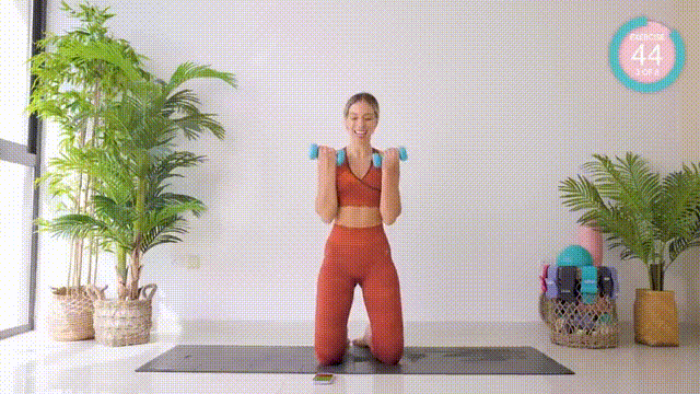 - Still kneeling, holding dumbbells at shoulder height, arms bent with palms facing forward.