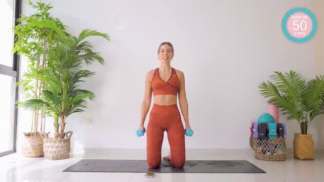 - Keep kneeling, holding dumbbells with palms facing towards the sides of your body.