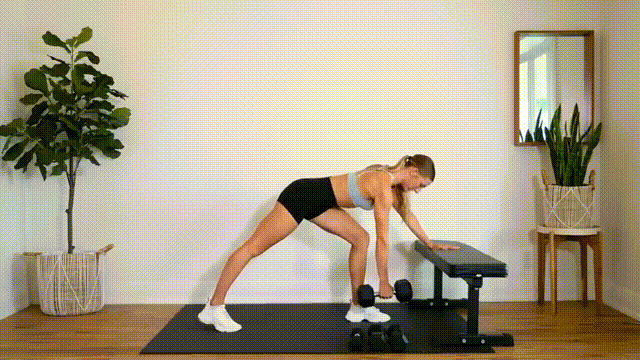 - Place one hand on the bench and hold the dumbbell with the other hand.