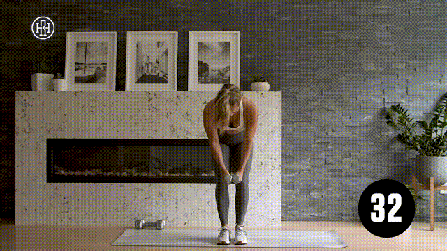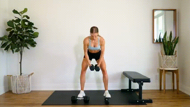 - Start by bending your knees and hinging at your hips so your torso is almost parallel to the floor, holding dumbbells in each hand.