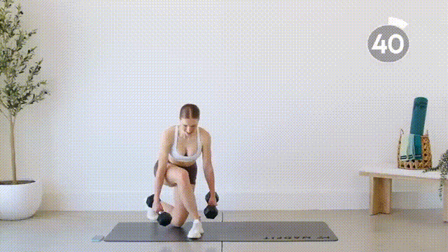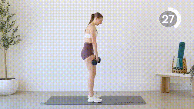 You’ll hinge at your hips (not your back!) while holding the weights, keeping everything nice and controlled.
