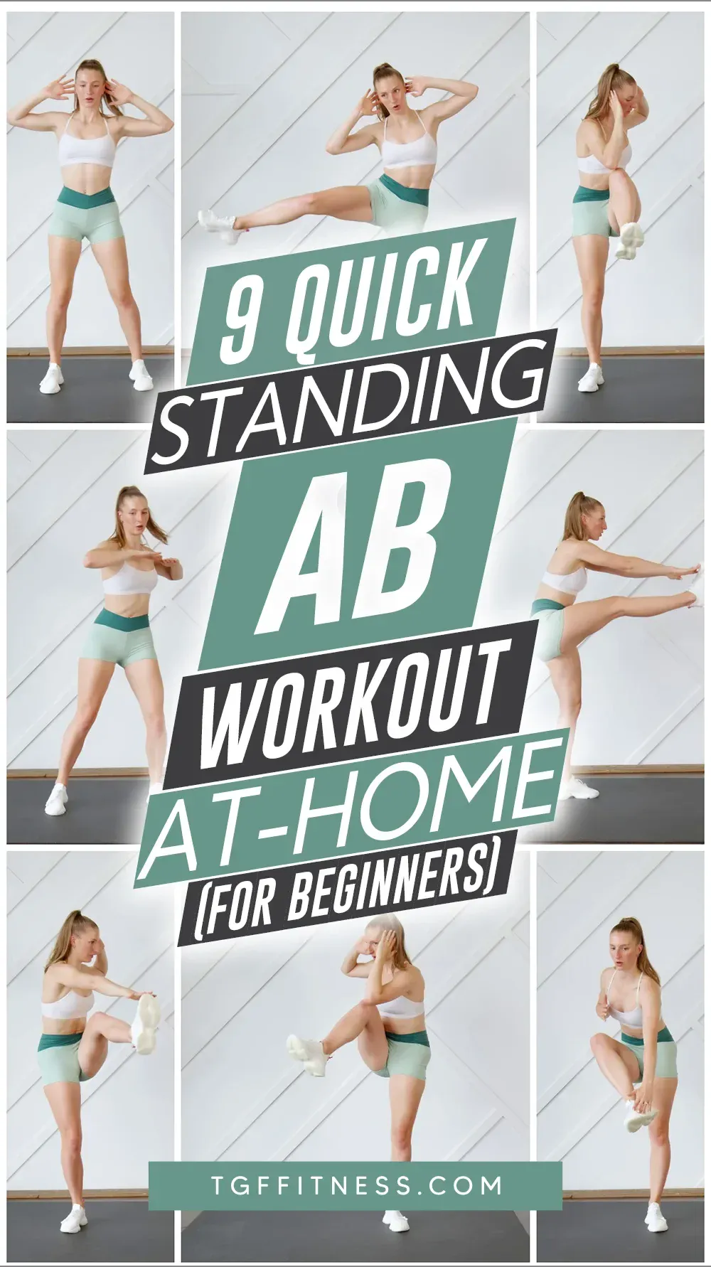 This workout consists of 9 simple standing ab exercises, each 45 seconds long with 15-second rest intervals. As with all ab workouts, you need an engaged core. It helps to visualize yourself sucking your belly button to your spine. Done? Jump right in!